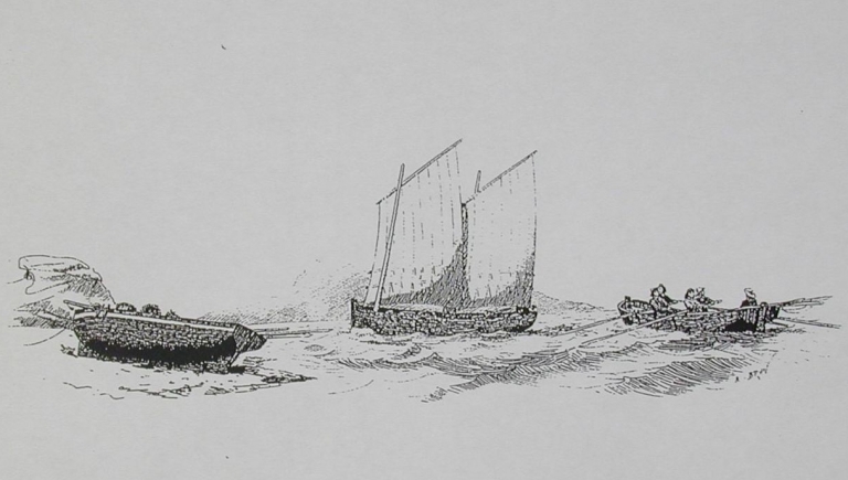 Dessin de bateaux de pêche de Ploumanac'h par A. Brun, fin du 19ème siècle : remarquer le gréement de chaloupe (collection particulière)Immatriculation