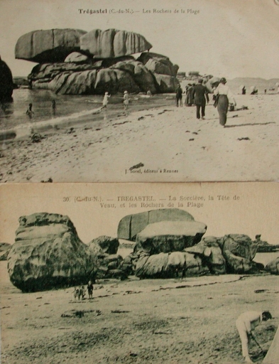 Les rochers de la plage de Coz Pors au 1er quart du 20ème siècle, avant et après 1923 : le rocher de la Sorcière est tombé par la foudre (collection particulière)Immatriculation