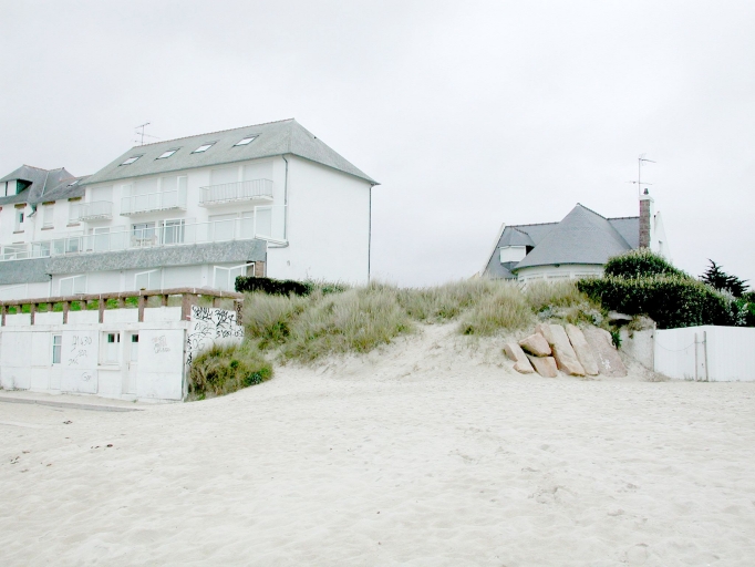 Une brèche dans le cordon dunaire à l'extrémité ouest de la Grève Blanche au devant de l'espace bâtiImmatriculation