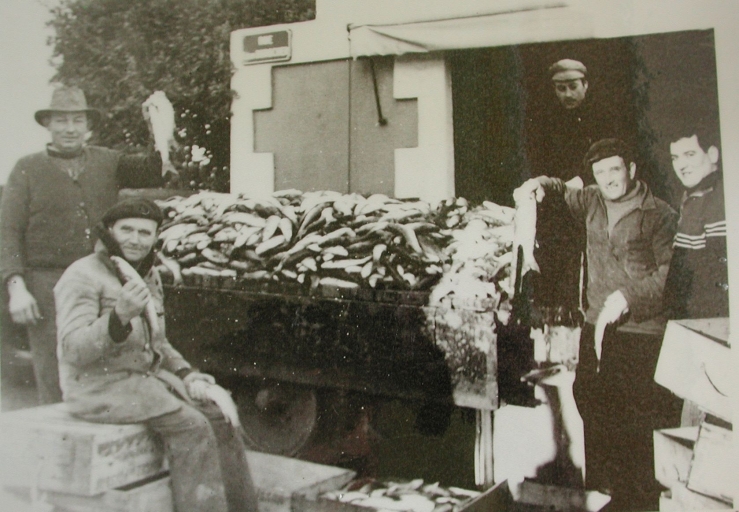 Groupe de marins-pêcheurs se réjouissant d'un bon coup de filet aux mulets, vers 1950-60 au local des pêcheurs : Edouard Bernable, Michel Normand (collection particulière)Immatriculation