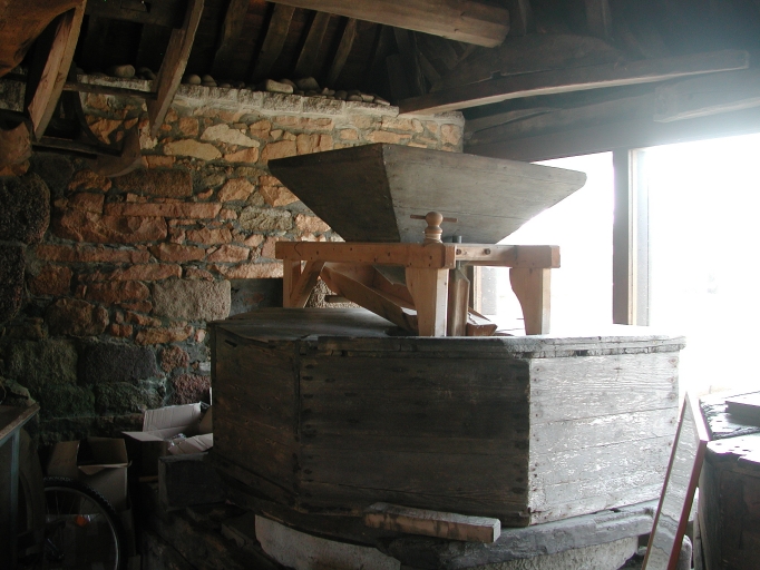 A l'intérieur du moulin : la trémie, l'auget et l'enchevêtrure, qui recouvre les meules, posées sur une estrade avec son coffrageImmatriculation