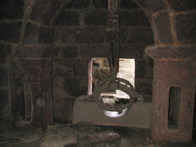 Détails : la lanterne et son marbre dans le grand caveau, avec les pierres à glissière sur le côté pour le réglage des meules ou levier de trempureImmatriculation