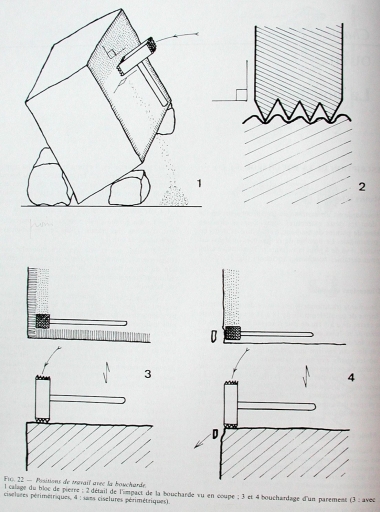 Position de travail avec la boucharde : calage du bloc de pierre, détail de l'impact, bouchardage d'un parement avec et sans ciselures (Bessac)Immatriculation