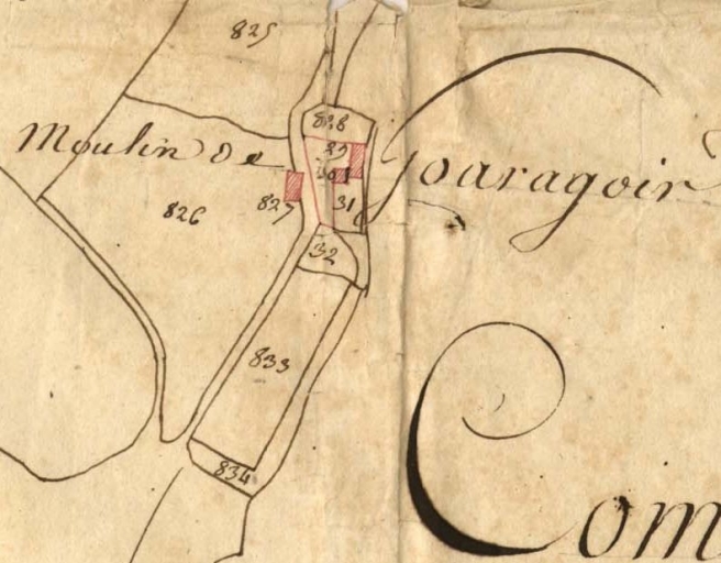 Détail du plan cadastral de 1819, B 829-827--83-832 : moulin de de Goaragoir (AD 22)Immatriculation