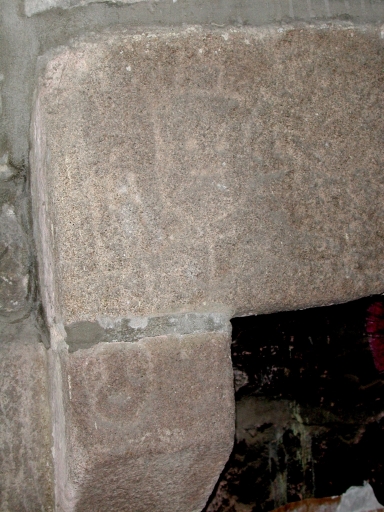 Vue de détail de l'écusson gravé dans la pierre de la cheminée du 1er étageImmatriculation