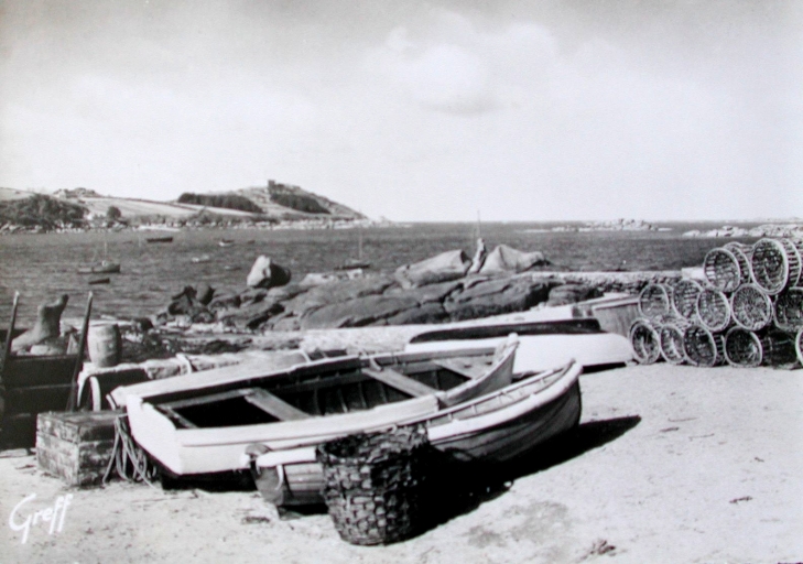 Les apparaux de pêche sur le quai et les canots Risque tout, vers 1950 (AD 22)Immatriculation