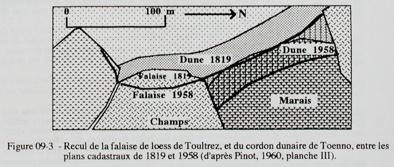 Recul de la falaise de loess de Toultrez et du cordon dunaire de Toëno, entre les plans cadastraux de 1819-1858 et 1960 (SMVM Baie de Lannion, Pinot, 1993)Immatriculation