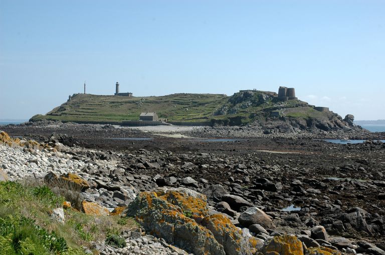 Vue de situation à marée basse depuis l'île Plate de la caserne et de la porte commandant l'accès à la cale primitive de l'île aux MoinesImmatriculation