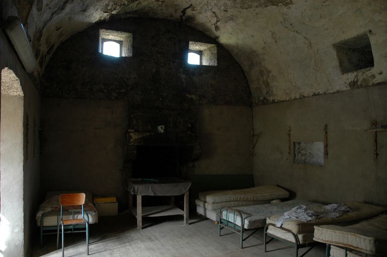 Vue de l'intérieur de la caserne de l'île aux Moines : casernement voûté ouest doté d'une cheminée. Le niveau des combles percé de baies est encore bien visibleImmatriculation