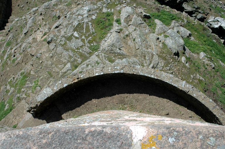 Vue du mur d'enceinte périphérique de la redoute, réduit de l'île aux Moines percé de créneaux de fusilladeImmatriculation