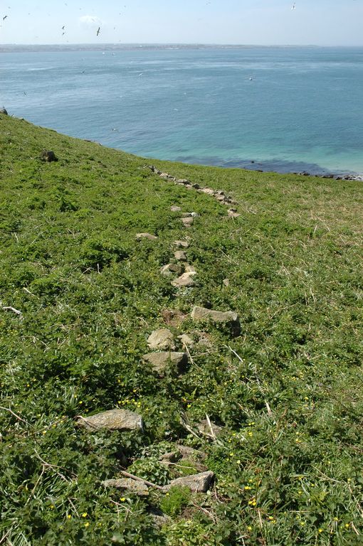 Vue de l'archipel des Sept-Iles : vestiges d'un mur de pierres sèches sur l'île BonoImmatriculation
