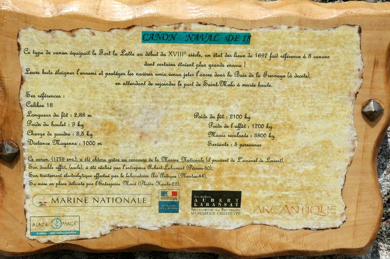 Vue du Fort La Latte : reconstitution d'un canon sur affût à châssis pivotant type Gribeauval. Signalétique en place : canon de 18 livres de balle, 2,88 m de longueur, 2100 kg (tube), 1700 kg (affût)Immatriculation