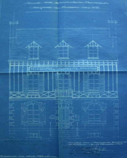 Plan de la façade du bureau des PTT dressé par l'architecte communal Joël Gidouin le 14 février 1923 (AD 22)Immatriculation