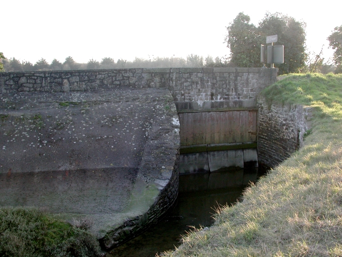 Vue du mur de soutènement, de la porte à marée du Clapet et de la digue, avec le circuit des eauxImmatriculation