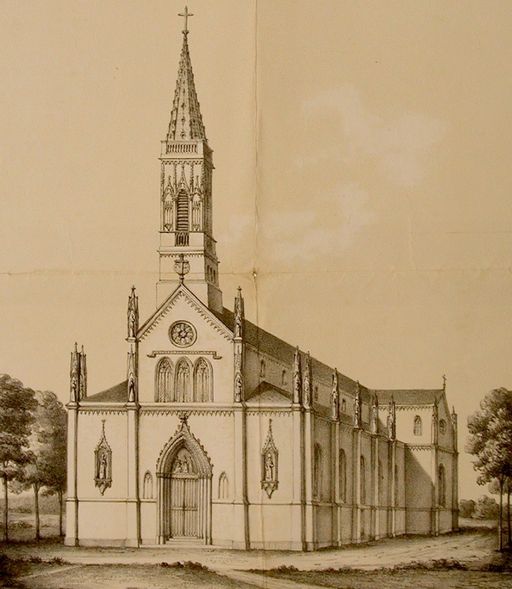 Projet de la nouvelle église paroissiale de Matignon, par l'architecte Bézier Lafosse, lithographie de l'imprimerie Landais & Oberthur, d'après le peintre H. Lorette, vers 1850 (AD 22)Immatriculation