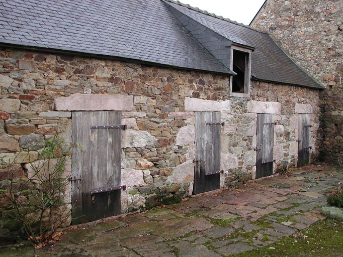 Vue de la grange ouest de la maison noble de Saline : remarquer les linteaux en grès et la cour pavéeImmatriculation