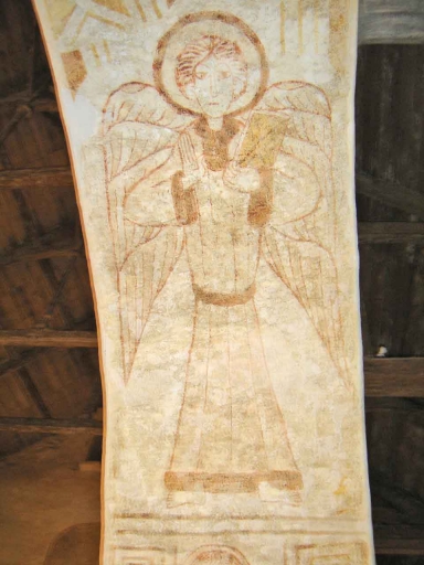 Ange nimbé et ailé représenté en pied, vêtu d'une robe resserrée à la taille, les pieds nus. Il tient un livre dans la main gauche et présente la paume de sa main droite au niveau de la poitrineImmatriculation