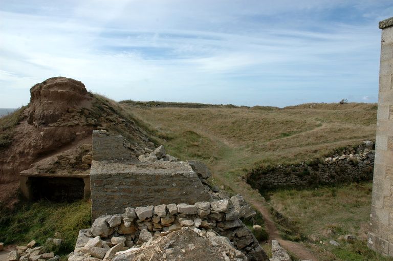 Vue de la batterie de Loqueltas. Emplacement d'une pièce d'artillerie moderne en place lors de la Seconde Guerre Mondiale. Le parapet en maçonnerie est ruinéImmatriculation