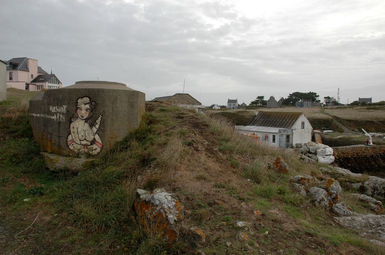 Vue de l'ensemble fortifié de Porspaul composé d'un blockhaus abri à personnels et d'un poste d'observation et de mitrailleuse dit TobroukImmatriculation