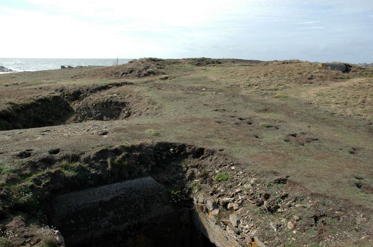 Vue de l'ensemble fortifié de Penn ar Viler, abri bétonné souterrain, position pour un canon de défense antiaérienImmatriculation