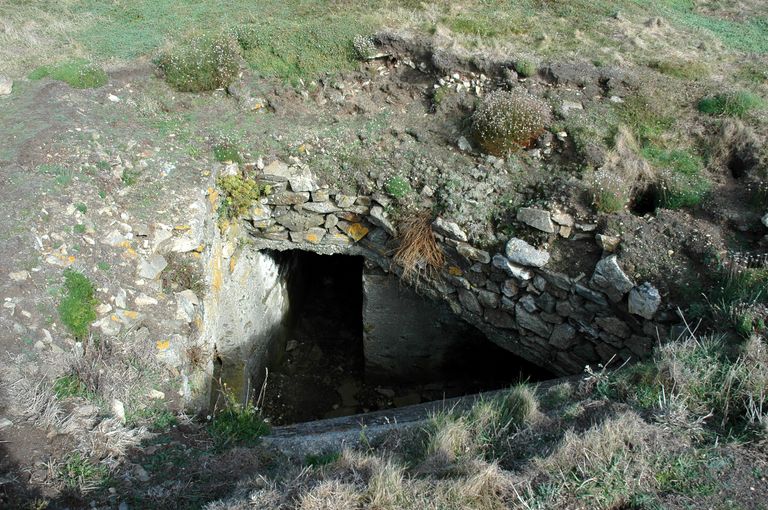 Vue de l'ensemble fortifié de Penn ar Viler, abri bétonné souterrain, position pour un canon de défense antiaérienImmatriculation