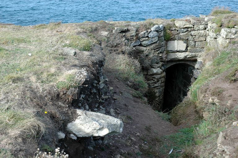 Vue de l'ensemble fortifié de Penn ar Viler, tranchée menant à une casemate aménagée dans le rocher pour canon de campagne tirant vers le nordImmatriculation