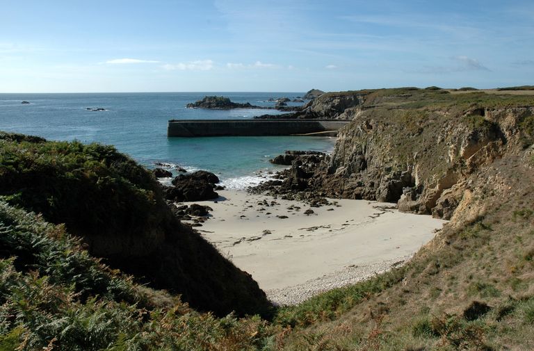 Batterie de côte (en arc de cercle), corps de garde, magasin à poudre (détruits) puis ensemble fortifié allemand de Porz ar Lan (Ouessant),