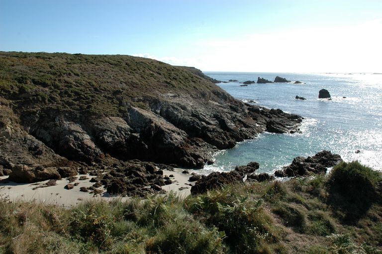 Batterie de côte (en arc de cercle), corps de garde, magasin à poudre (détruits) puis ensemble fortifié allemand de Porz ar Lan (Ouessant),
