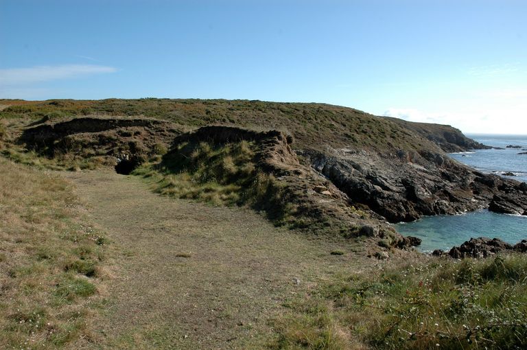 Batterie de côte (en arc de cercle), corps de garde, magasin à poudre (détruits) puis ensemble fortifié allemand de Porz ar Lan (Ouessant),