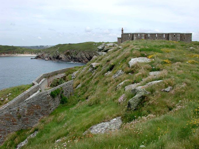 Vue générale du réduit de batterie de côte de la pointe de Kermorvan depuis l'ouest. L'implantation du réduit derrière un rocher en glacis permet d'utiliser au mieux les créneaux de fusillade de la terrasse pour la défense de l'ouvrageImmatriculation