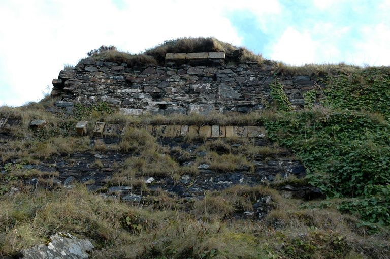 Vue de la batterie à tir rapide Robert : mur avec fruits en appareils de schiste et bandeau de gré jaune. Il semble y avoir superposition de deux plate-formes l'une sur l'autreImmatriculation