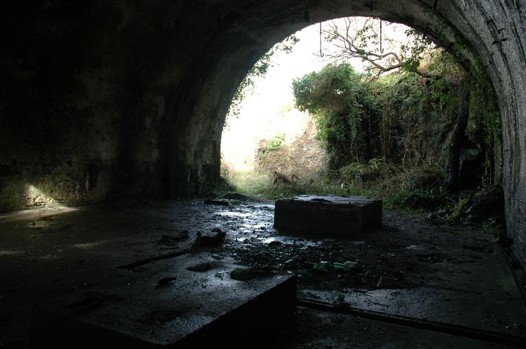 Groupe de 2 projecteurs de 60 cm et 90 cm et usine électrique, au ras de l'eau, Pointe Robert (Roscanvel),