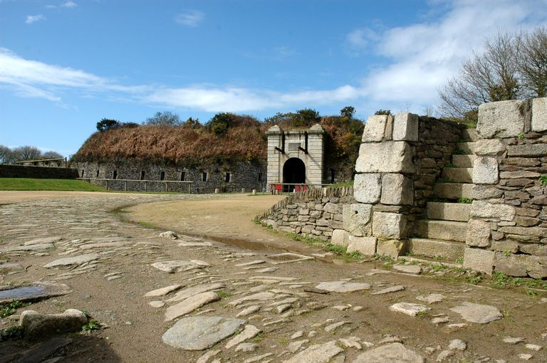 Vue du fort détaché du Questel : sortie de la place d'armes de la porte, détails de la chaussée empierrée et d'anciens ancragesImmatriculation