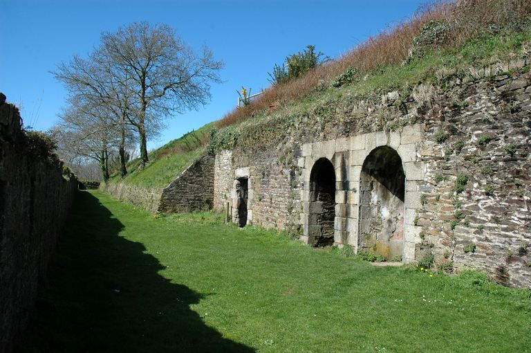 Vue du fort détaché du Questel : face de Keranroux, chemin de ronde protégé par un mur défensif percé de créneaux de mousquetterieImmatriculation