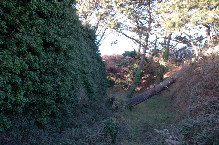Vue du réduit de batterie de côte dit redoute intermédiaire des Blancs Sablons : fossé sec envahi par la végétationImmatriculation