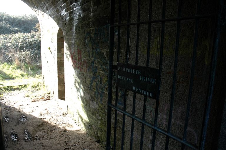 Vue du réduit de batterie de côte dit redoute intermédiaire des Blancs Sablons : passage d'entrée, grille de protection ouverte, signalétique PROPRIETE PRIVEE DEFENSE D'ENTREEImmatriculation