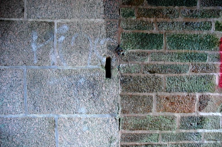 Vue du réduit de batterie de côte dit redoute intermédiaire des Blancs Sablons : passage d'entrée, manque de liaisonnement (collage : ?) entre l'appareillage en pierre de taille de granite et les moellonsImmatriculation