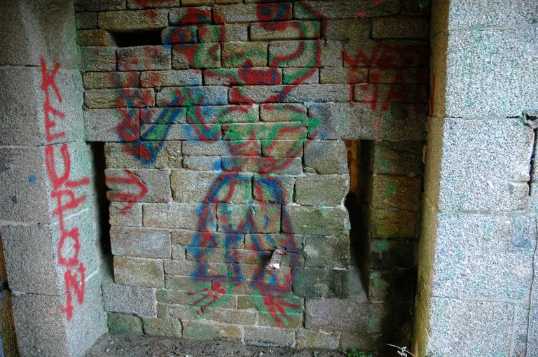 Vue du réduit de batterie de côte dit redoute intermédiaire des Blancs Sablons : créneaux de fusillade flanquant le passage d'entréeImmatriculation
