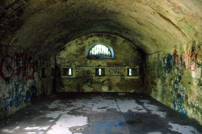 Vue du réduit de batterie de côte dit redoute intermédiaire des Blancs Sablons : casemate servant au logement des soldats (en temps de paix : 6 soldats et un sous officier séparé par une cloison ; en temps de guerre : 8 soldats et un sous officier)Immatriculation