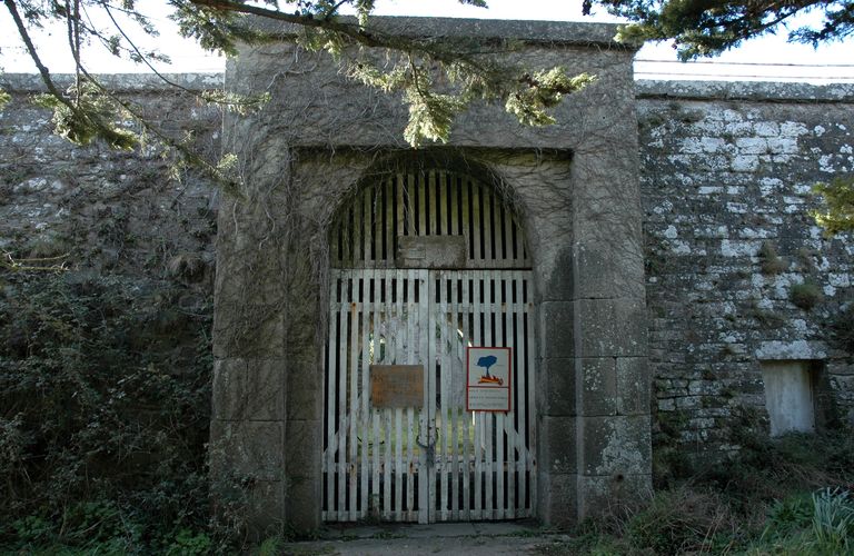Vue du réduit de batterie de côte dit redoute sud des Blancs Sablons : porte d'entrée monumentale à pont-levis. Le fossé sec a été remblayéImmatriculation