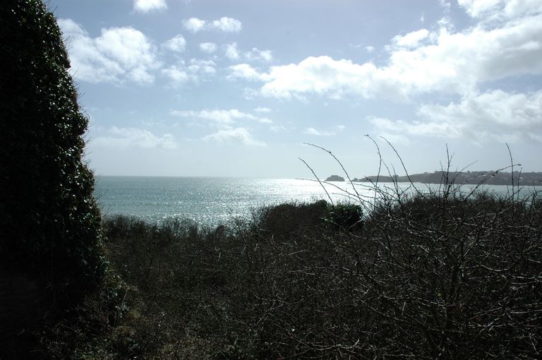 Vue de l'ensemble fortifié de Toul-Logot : batterie de côte, corps de garde et poudrière (vestiges envahis par la végétation). En arrière-plan : l'anse de BertheaumeImmatriculation
