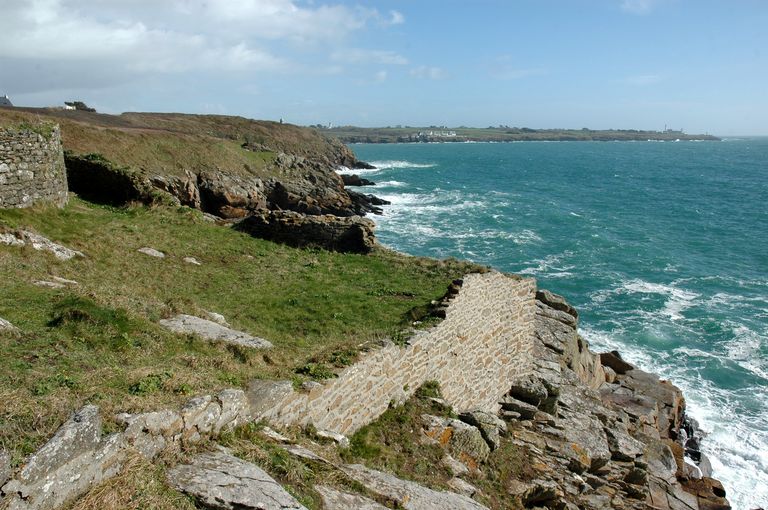 Vue de l'ensemble fortifié de la pointe du Renard : batterie de côte. En arrière-plan : la pointe Saint-MathieuImmatriculation