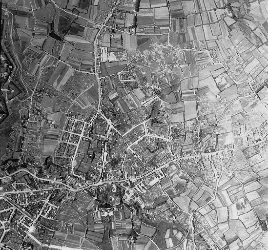 Vue aérienne verticale de l'ouvrage fortifié du Bouguen et du quartier de Kerinou, 1944Immatriculation