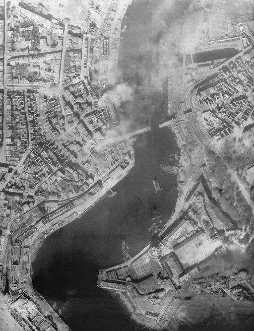 Vue aérienne verticale de Brest, rivière de la Penfeld. A droite sur la photographie, un blockhaus marqué d'une croix rouge est visible. Septembre 1944Immatriculation