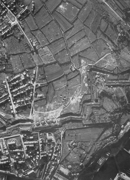 Vue aérienne verticale de l'ouvrage fortifié de Quéliverzan. On distingue la batterie de Quéliverzan installée dans le fossé sec. 31 août 1944Immatriculation