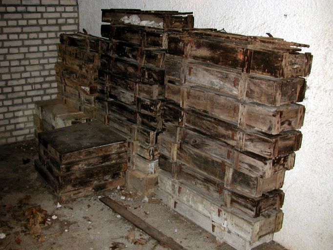Brest, batterie extérieure du Portzic : magasin à poudre modèle 1879, sas d'entrée servant d'aire de stockage, caisses contenant des carottes de sondage géologiqueImmatriculation