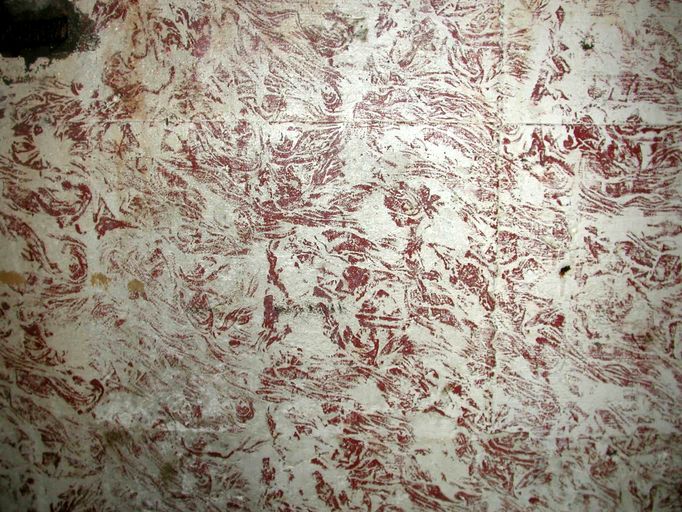Vue de l'un des murs peints en ocre rouge tacheté - moucheté (état en 2003)Immatriculation