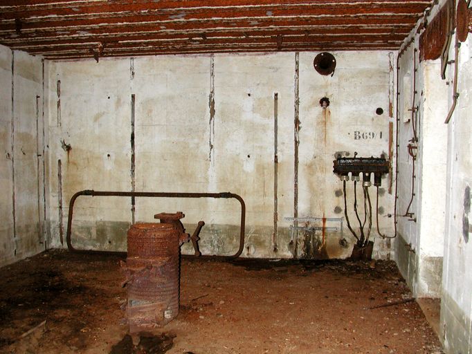 Bunker - abri pour deux groupes de type 502 (B 69/1) de Kervaoter : vue de la chambre de troupe de droite avec son boîtier de connexion téléphonique surmonté du numéro "B 69/1", son poêle de forteresse, un châssis tubulaire de couchette posé contre le mur et son câblage... (état en 2003)Immatriculation