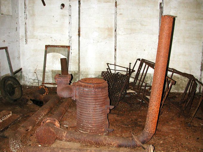 Vue de la chambre de troupe de gauche : poêle de type Wt 80K et tuyaux de ventilation... (état en 2003)Immatriculation