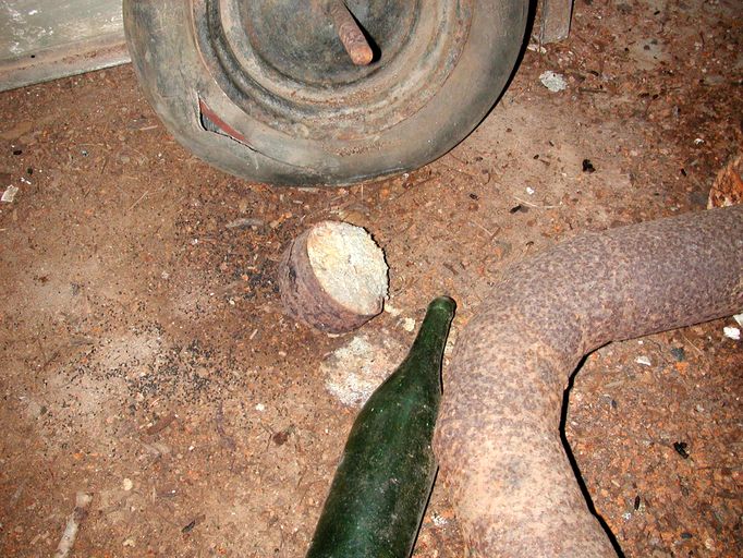 Vue de la chambre de troupe de gauche : cartouche de masque à gaz gisant au sol (état en 2003)Immatriculation